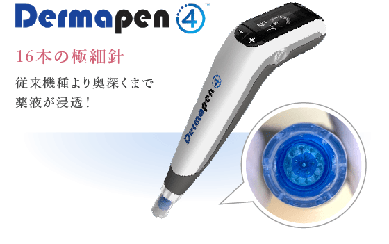 元々、ダーマペンはオーストラリアで生まれた美容療法で、2011年に「ダーマペン1」が発売されてから改良が重ねられ、現在は「ダーマペン4」が使用されています。最新の「ダーマペン4」は先端に16本の針を備え、針を刺す深さを3.0mmまで調整することで肌トラブルに応じたアプローチが可能です。また、小ペン型の機器なので、美容液注入では難しい目元の近くや小鼻など、細かい範囲もしっかりケアできることが特徴です。